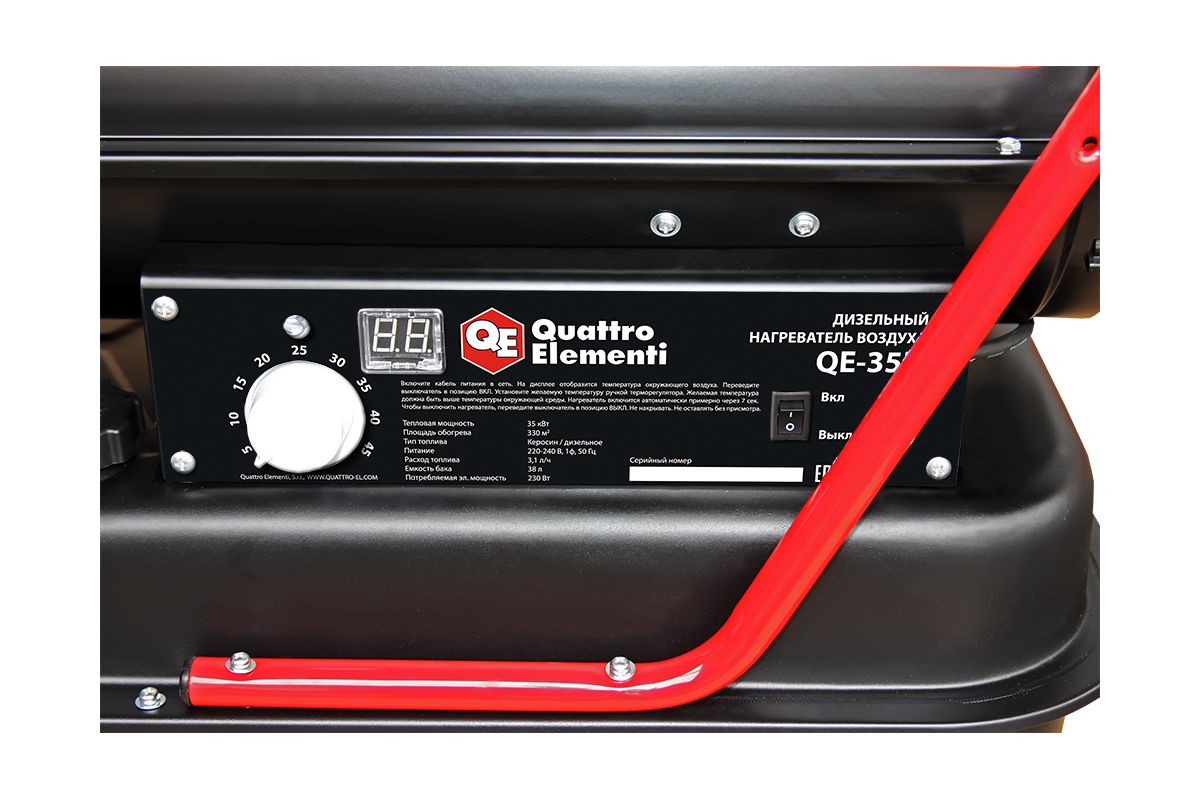 QUATTRO ELEMENTI QE- 35D 243-912 – тепловая пушка для обогрева нежилых помещений. Тепловая мощность 35000 Вт. Обогревает помещения до 350 м²: склады, ангары, цеха и т.д. Работает от дизельного топлива и розетки 220 В.