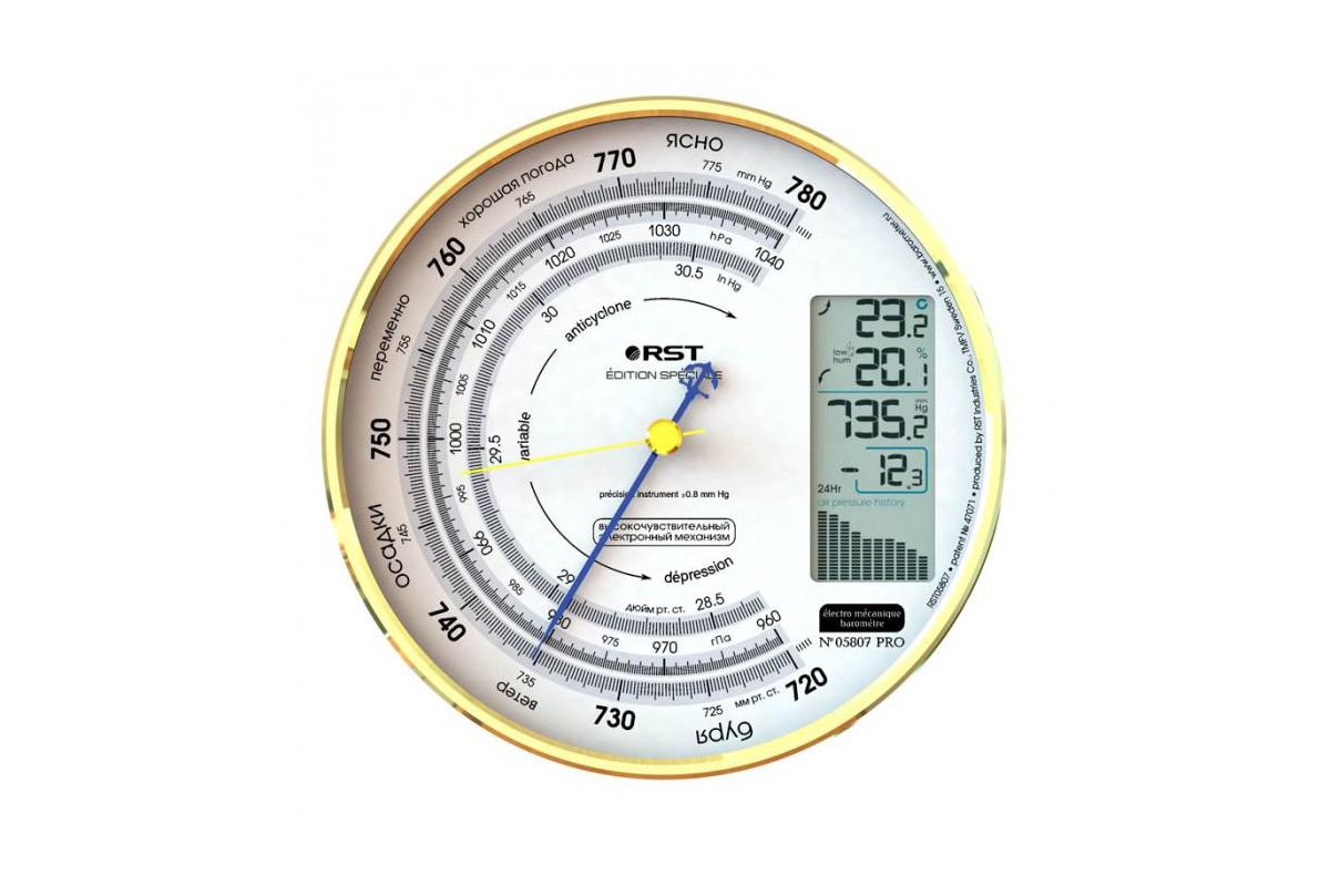 Новая серия барометров от компании RST не имеет аналогов. Уникальность этих приборов заключается в использовании точных цифровых датчиков давления и электронно-механического метода передачи их на классический круглый циферблат со стрелкой. При этом шкала прибора имеет разрешение 0,2 миллиметр ртутного столба. Барометр совмещает в себе механический циферблат и цифровой жидкокристаллический дисплей отображения данных. На дисплее каждые 18 минут измерения отображается изменение атмосферного давление за выбранный промежуток времени (3 / 6 / 12 / 24 часа). Дисплей барометра также строит график изменения атмосферного давления за установленное время. Уникальный алгоритм масштабирования графика при любых, даже очень сильных, колебаниях атмосферного давления выстраивает правильную наглядную кривую. Температура и относительная влажность воздуха в помещении.