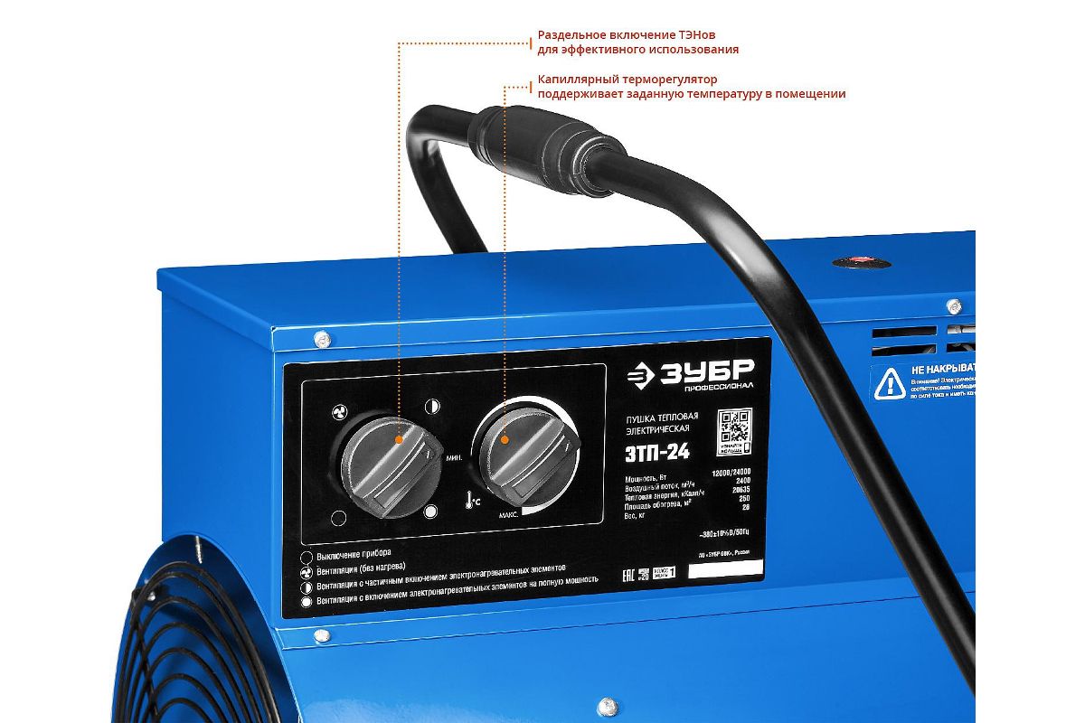 ЗУБР ЗТП-24 – электрическая тепловая пушка может использоваться в качестве основного или дополнительного источника тепла в пространствах площадью до 250 м². Мощность 24 кВт. Производительность 2400 м3/ч. Напряжение 380 В. Применяется в производственных или складских помещениях.