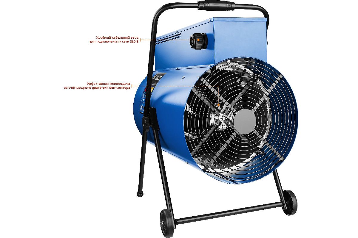 - Трубчатый ТЭН из нержавеющей стали не пересушивает воздух и не сжигает кислород. Пушку можно использовать в жилых помещениях, мастерских, магазинах и офисах.